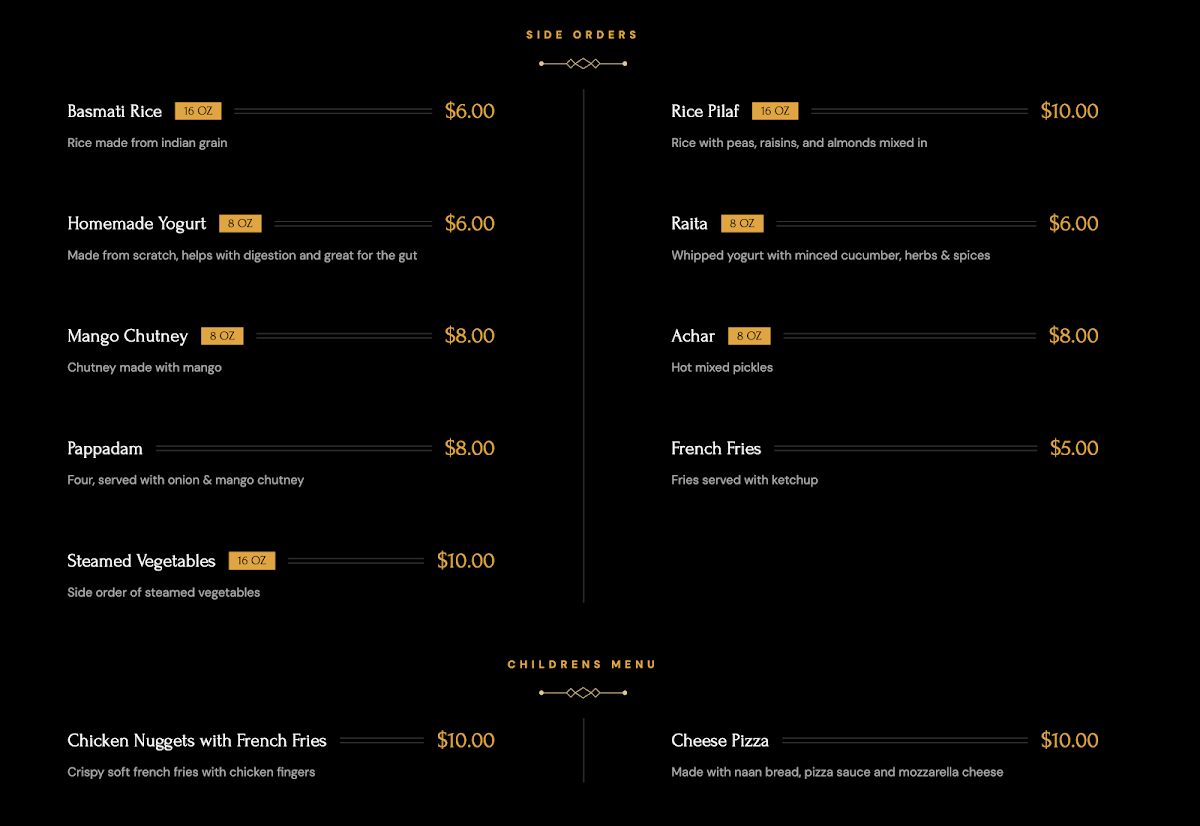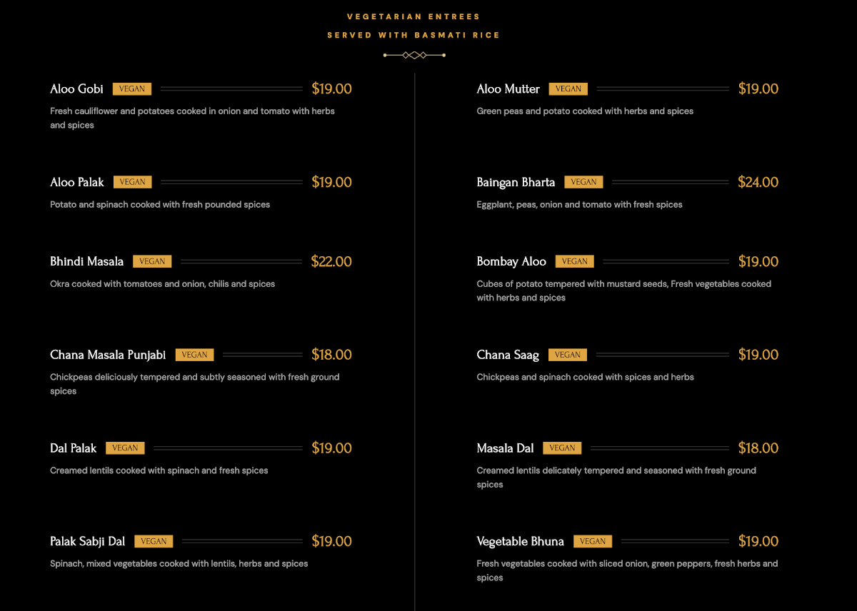 For the main course, indulge in the rich flavors of Butter Chicken or the hearty Chicken Saag Wala, expertly crafted with spices that reflect traditional Indian cooking. Each dish is served generously, ensuring satisfaction with every bite. Don't forget to explore their tempting non-vegetarian platter, featuring a delightful mix of kabobs.